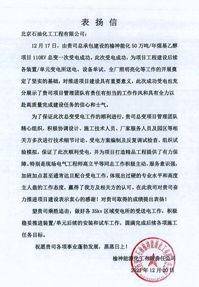 近日,延長石油榆神能化公司再次發來表揚信,對北京石油化工工程有限公司總承包的50萬噸/年煤基乙醇項目110KV總變一次受電成功表示祝賀。此次受電成功,為項目工程建設后續各裝置/單元變電所送電、設備單試、全廠照明亮化等工作的開展奠定了堅實的基礎,對推進項目建設具有重要意義。