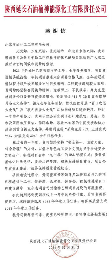元旦前夕,北京石油化工工程有限公司先后收到延長石油集團和旗下的榆神能化公司發(fā)來的感謝信,信中對北油工程EPC總承包的50萬噸/年煤基乙醇項目建設(shè)期間付出的辛勤勞動表示感謝,并向項目現(xiàn)場廣大職工致以節(jié)日的問候。