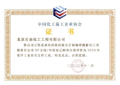 近日,由北京石油化工工程有限公司(簡稱:北油工程)總承包的榆神能化50萬噸/年煤基乙醇項目獲得中國化工施工企業協會頒發的“2022年度化學工業優質精品工程”、“2022年度化學工業安全文明工地”及“2022年度化學工業綠色施工工程”等三項殊榮。