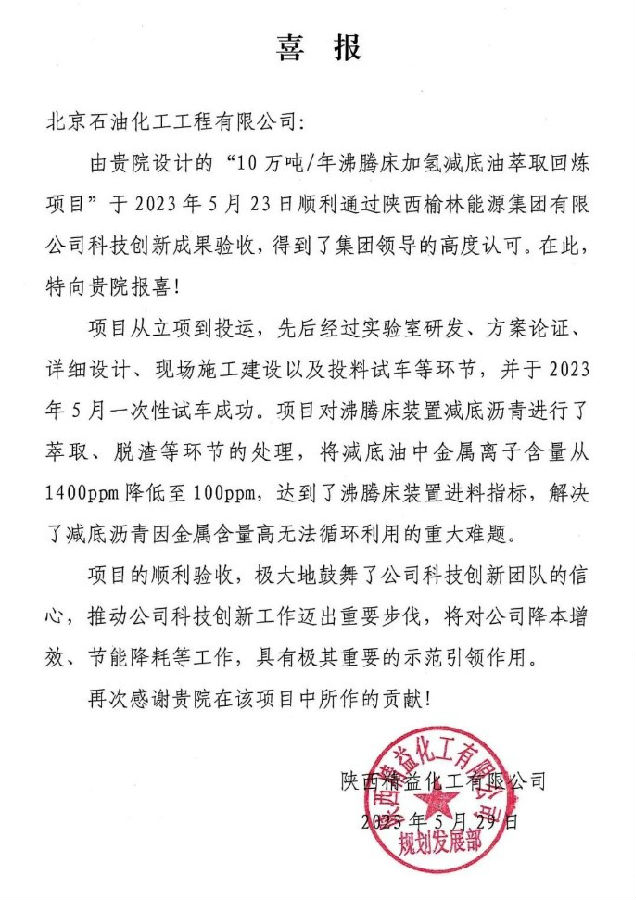 近日,由北京石油化工工程有限公司設計的陜西精益化工10萬噸/年減底油萃取回煉項目開車成功并通過業主驗收,得到業主的高度認可。該項目以沸騰床煤焦油加氫裝置的減底油渣為原料,回收其中可重復利用的組分,并將油渣中的膠質/瀝青質及金屬離子含量控制在一定范圍內,從而滿足沸騰床回煉的進料要求,為焦油加氫企業處理未轉化的油渣提供了一條全新途徑,大幅提升了企業經濟效益。(通訊員/韓金奇)