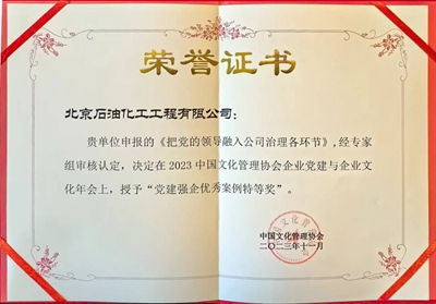 北京石油化工工程有限公司榮獲“黨建強企優秀案例特等獎”。公司持續夯實黨建基礎,塑強黨建品牌,筑牢紅色堡壘,打造特色黨建文化,營造濃厚黨建氛圍。