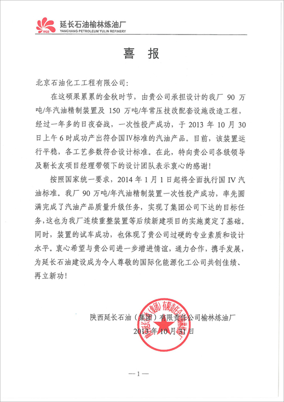 由我公司承擔設計的榆林煉油廠90萬噸/年汽油精制裝置,經過一年多設計和施工單位的日夜奮戰,已于2013年10月30日成功生產出符合國IV標準的汽油,目前該裝置運行平穩,各工藝參數達到設計指標。為此,業主單位延長石油榆林煉油廠特向我公司發來喜報。